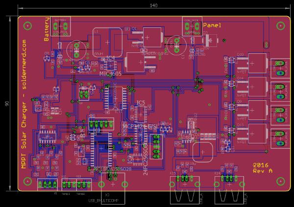 I’m currently waiting for the boards for my Ultrasonic Anemometer Rev B to arrive from Hong Kong and this gives me some time to write about the MPPT Solar Charger design that I did quite some time ago. I published a series of posts on a Arduino MPPT Solar Charger Shield and got a lot of encouraging feedback. But that shield was more of a proof-of-concept than a finished product. While it generally performed well it drew way too much current when idle to actually be deployed unless you can count on plenty of sunshine every day.