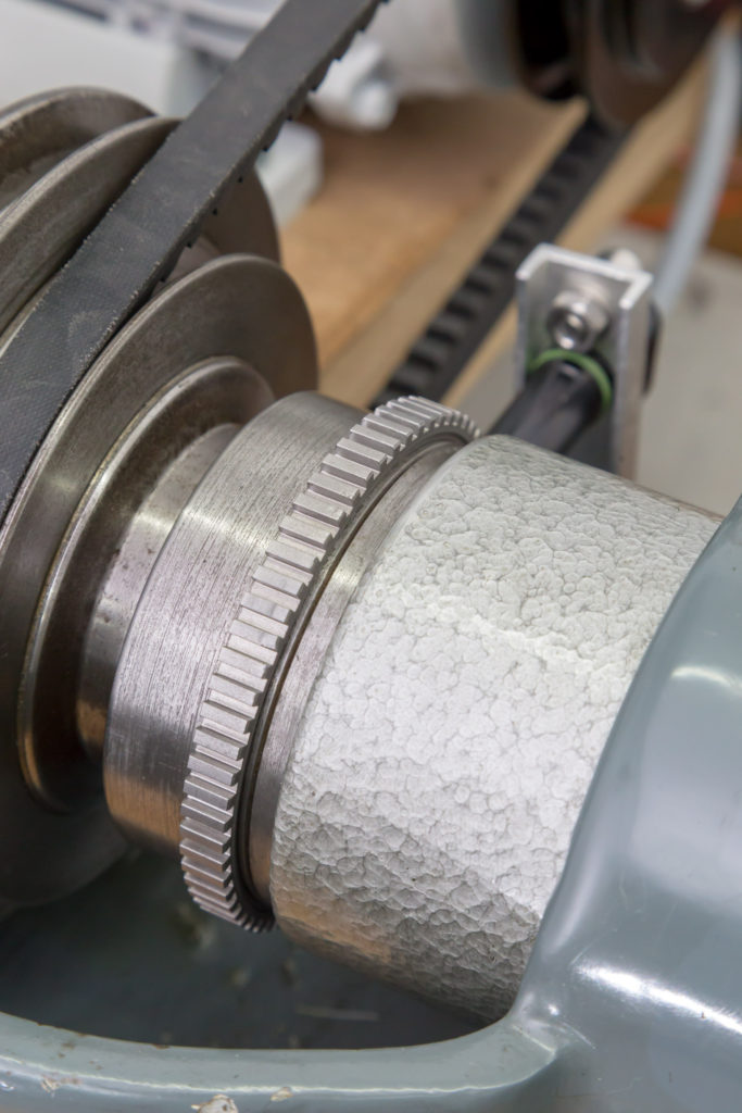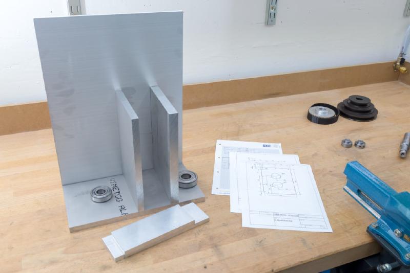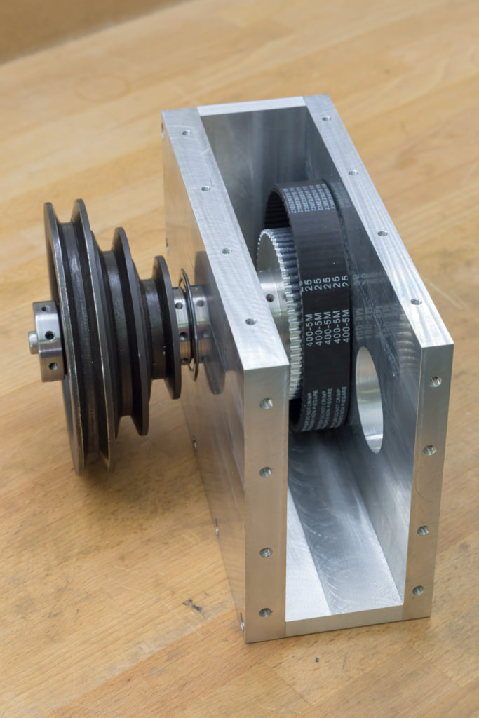 Just turning an adapter for the original pulley was not really an option because that would have resulted in a top speed of 8000+ RPM while only going down to about 200 RPM in low gear. So I decided to use the original pulley but with a fixed 2:1 reduction before that, giving me a more useful 100-4200 RPM range. For that purpose, I decided to use a 25mm, HTD-5M toothed belt.